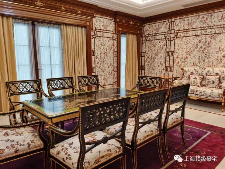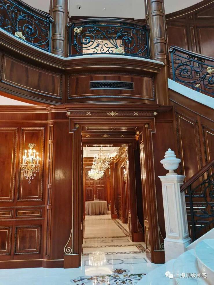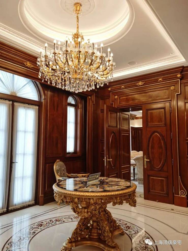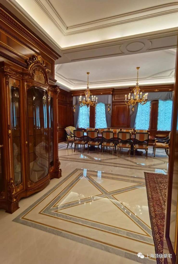 除了这栋超奢华的样板房,其他别墅装修的奢华程度也都超乎想象,随便拿出一栋,内部精致华丽程度都堪比宫殿。比如这栋英国亚当风格别墅的内部装修,延续建筑亚当风格之外,点缀了少量中国元素,精致大器之余,又底蕴十足。