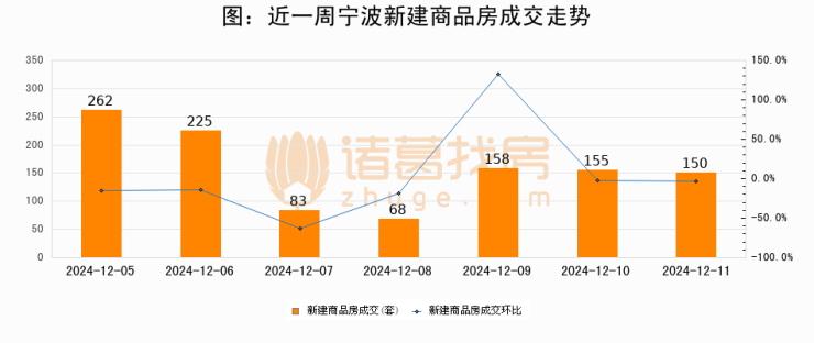 根据宁波市房产市场管理中心数据显示,2024年12月11日宁波新建商品房成交150套,较昨日减少5套,环比下降3.2%