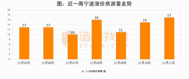 根据诸葛找房数据显示,宁波24小时涨价房源量为17套,较12月10日增加2套,环比上涨13.3%。与此同时,涨价房源占比小幅扩大,业主信心有所提升。