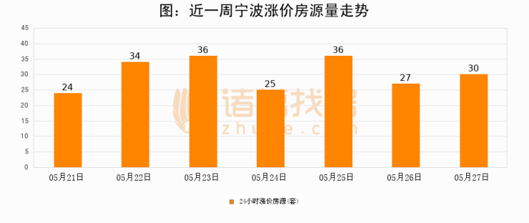 根据诸葛找房数据显示,宁波24小时涨价房源量为30套,较05月26日增加3套,环比上涨11.1%。与此同时,涨价房源占比小幅扩大,业主信心有所提升。