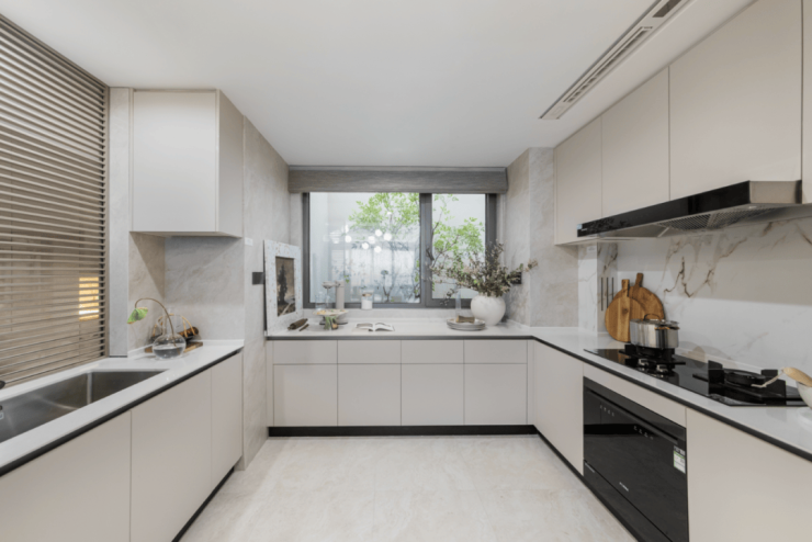 厨房配置了西门子(或同档次品牌)灶台、油烟机、方太(或同档次品牌)洗碗机、弗兰卡(或同档次品牌)水槽以及凉霸;