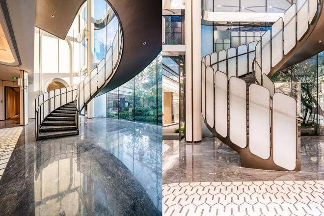 过去在豪宅项目才能看到的类似于“星空顶”地下车库坡道,招商臻境使用了看来更加高级的香槟金色吊顶,并加上穹顶闪耀的“追光”坡道!精装的地下大堂,配置了自然的采光井以及专属等候区,如同高级酒店的首层大堂,极尽礼宾仪式!精装地上大堂,地面的石材拼花造型,墙面的石材背景,将静奢海派的艺术展现的淋漓尽致!