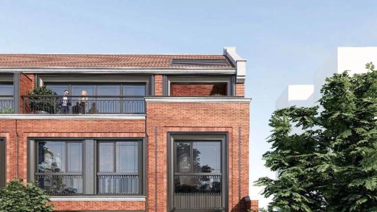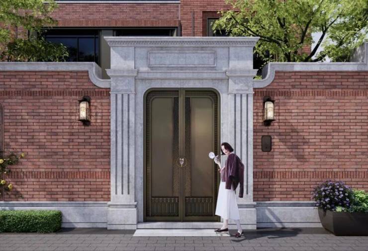 采用红砖+水刷石立面,融合石库门元素与现代设计,打造“新时代海派墅居”