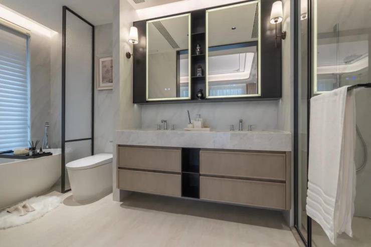 有大金的中央空调、新风地暖;厨房用的是嘉格纳的4件套(2台冰箱、蒸烤箱、洗碗机),以及博世的吸油烟机和灶具;卫浴选用唯宝、高仪、汉斯格雅等国际品牌,所有卫生间都配了智能马桶,主卫还配了美妆冰箱。