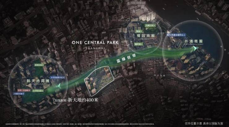 距离新天地直线距离约400米,作为蓝绿丝带规划上的关键节点,随着大新天地东进南拓战略逐步实施,通过水景、绿地和公共空间,串联新天地、豫园、外滩三大世界级商业版图。