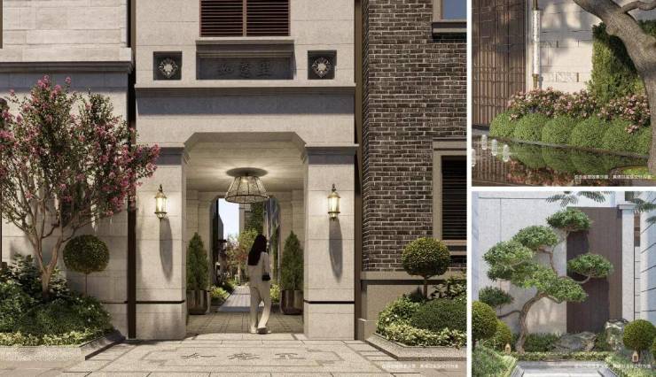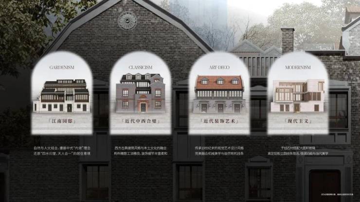 贯彻“中意西景、中正西融”景观理念,以中式花园隐居哲学核心,传承中式里弄记忆、融合西式花园情调。提取场地四种建筑和场域风格特征,营造中西风貌交叠的别墅花园景观,演绎当代海派风情里弄人居。