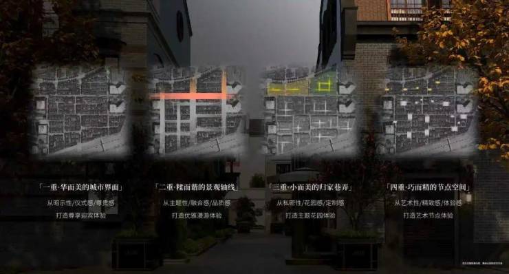 从城市界面到节点空间,由大到小打造“四重空间感受”,营造中西和鸣的感官体验。从华而美的城市道路、糅而谐的景观轴线,美而精的归家巷弄、雅而巧的节点空间,每一处场景皆实现私密与艺术的交融,感受城市繁华与归家宁静的交叠。