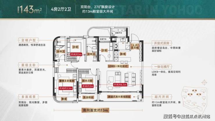 约13米南向大面宽、四开间朝南,把全天候阳光与清风引入室内,藏满惬意生活小确幸。