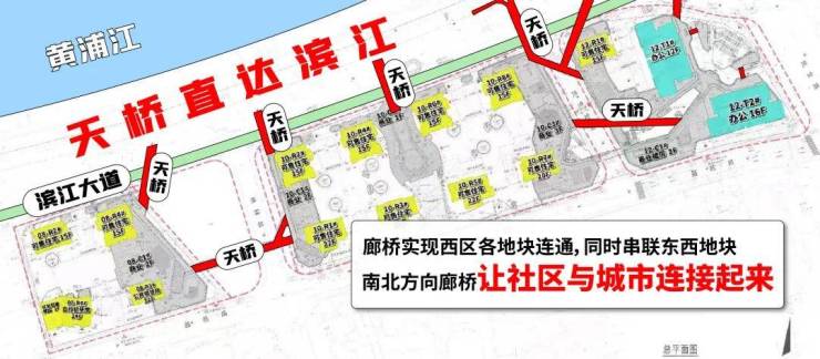 同时南北方向的5条廊桥,让业主不用过马路就能通达黄浦江畔滨江步道,实现地块内外联动。