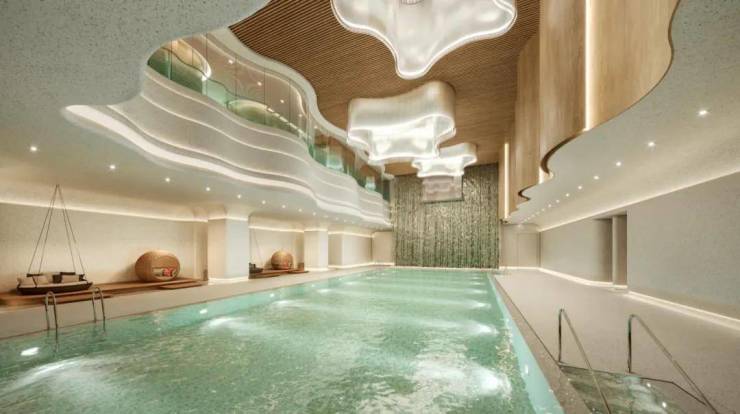 两层挑高的泳池,目及之内满屏的“弧形”元素,还能从天顶上引入自然光,让你感受到在别有洞天之地游泳的体验。