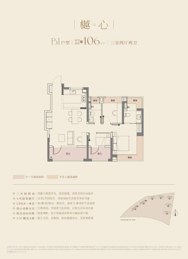 建筑面积约106㎡户型,更是以宽尺大横厅和270°的转角飘窗赚足了眼球,阳光与清风自由流淌,居住舒适度全面提升。LDKB一体化设计,在餐厨区布局万能中岛台,打破了厨房与餐厅的界限,延伸烹饪空间,增加收纳空间,更将社交功能融入其中,重塑中国人的情感场域。
