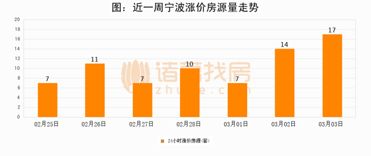 根据诸葛找房数据显示,宁波24小时涨价房源量为17套,较03月02日增加3套,环比上涨21.4%。与此同时,涨价房源占比小幅扩大,业主信心有所提升。