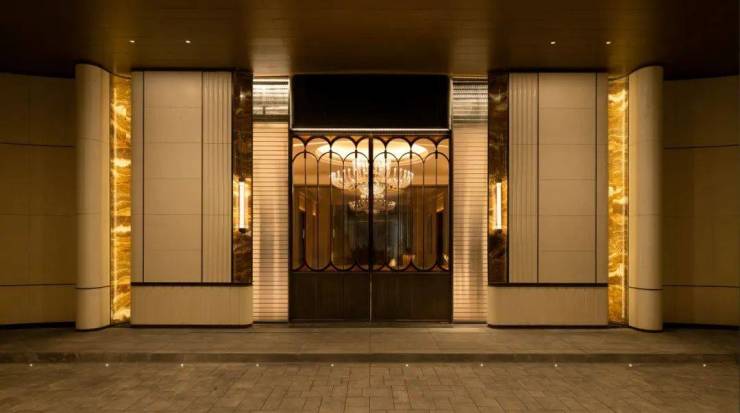 门庭延街的外立面,以精工定制弧形贝金米黄大理石为主调,镶嵌典藏级老虎玉大理石,点缀古铜色现代海派艺术感灯器,整体呈现出百年海派的贵雅气质。