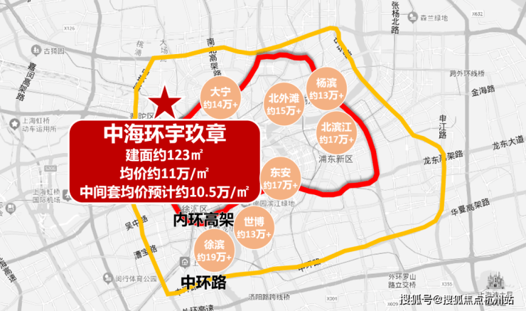 对比同能级板块:内环内新房普遍12万+/㎡,静安曹家渡板块单价达17万+/㎡、虹口核心区14.5-16.5万/㎡;内中环大宁14万+/㎡、长宁中环旁12-13万/㎡、浦东世博13万+/㎡。