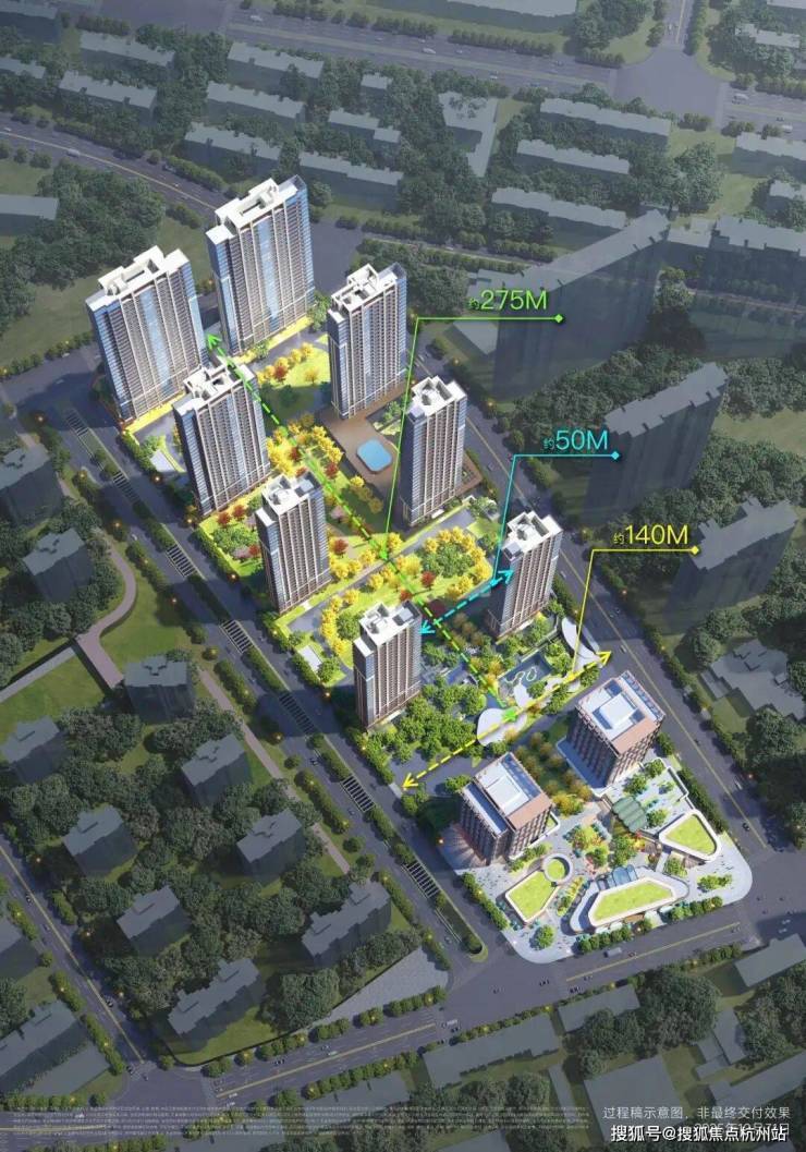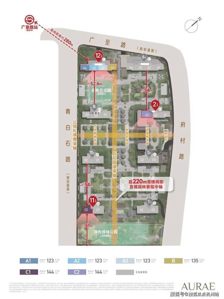 整体规划中, 纵向中央绿轴超200米,横向景观轴约140米,南北楼间距约50-57米,东西间距也多超过44米,实现更好的采光通风效果与景观视野!