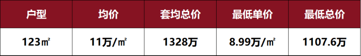 据了解,本次加推约123㎡户型预计均价仅约11万/㎡,中间套更是低至约10.5万/㎡,是绝对的内环旁门槛级价格!