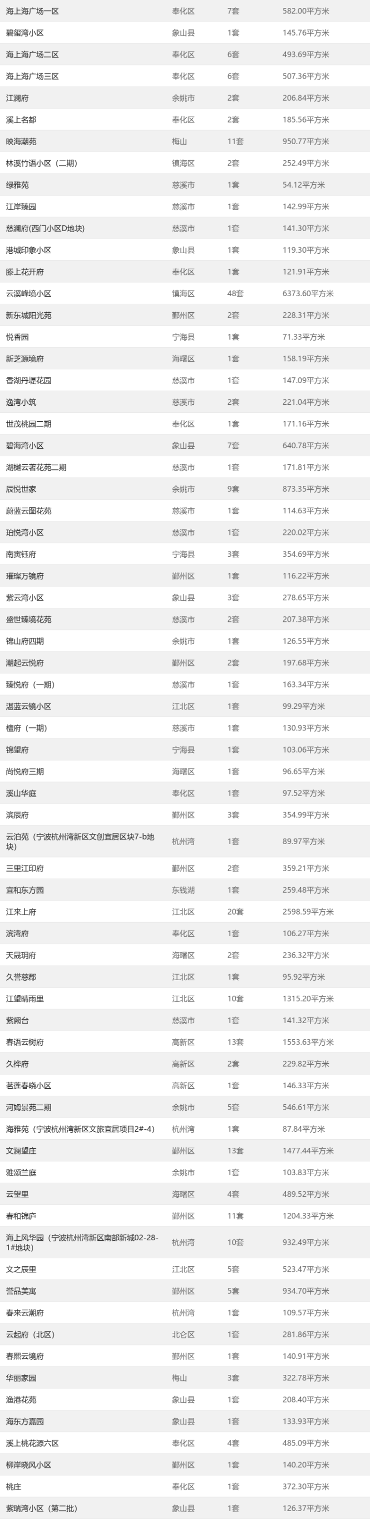 镇海区成交50套,销售面积6626.09平方米,位居排名前列;鄞州区成交41套,销售面积5153.99平方米,位居第二。江北区成交37套,销售面积4632.47平方米,位居第三;