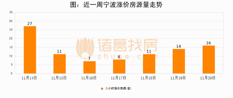 根据诸葛找房数据显示,宁波24小时涨价房源量为16套,较11月19日增加2套,环比上涨14.3%。与此同时,涨价房源占比小幅扩大,业主信心有所提升。