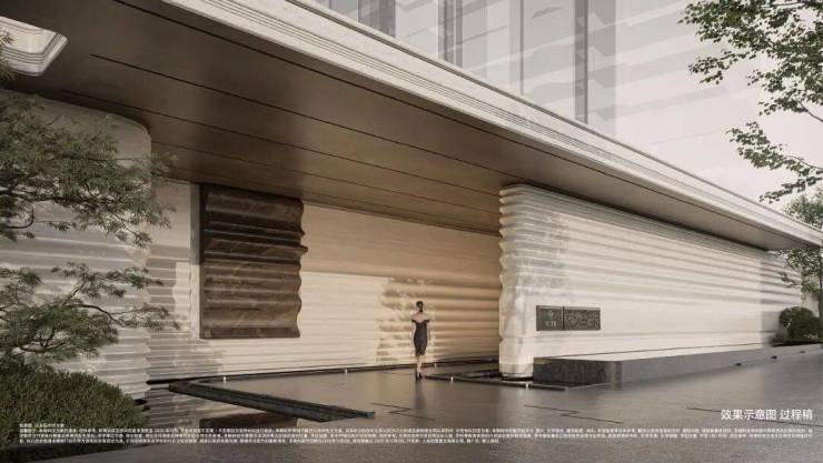 建筑立面上,项目萃取希腊柱式秩序感,以古铜色铝板、超大玻璃幕墙与灵动弧线的高端组合,窗墙比最大达0.35,呈现出温润典雅的质感。同时,秉持“揉石成缎”的审美理念,以温润隽永的弧度造型呼应海派河流意向,打造项目温润雅奢的气质美学,呼应在文化下长成的高端客群。