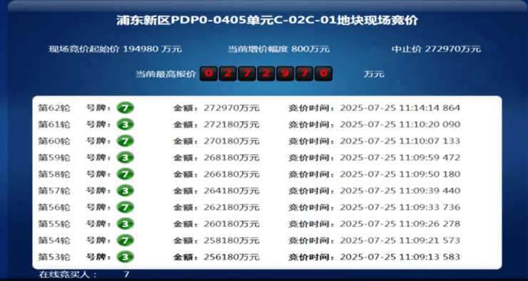 7月25日,上海2025年六批次土拍中浦东唐镇地块,最终由招商蛇口&中旅投资以中止价27.297亿元+商品住宅装修标准不低于4500元/㎡(集采价)+公共服务设施200㎡(计容)+高端人才住房配建比例0.7%竞得地块,成交楼面价52360元/㎡,溢价率40.00%!
