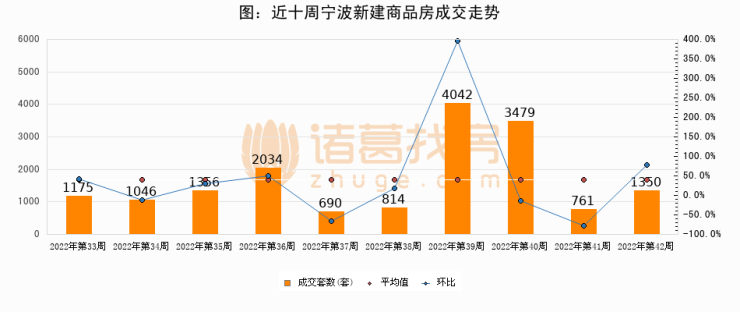 进入2022年第42周(10月10日-10月16日),宁波新建商品房成交1350套,较上周增加589套,环比上涨77.4%