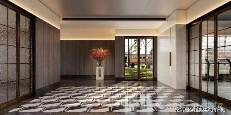 双归家精装大堂采用莫奈花园奢石、土耳其奥特曼米黄雕琢墙面,香格里拉黑水刀拼花铺就地板;