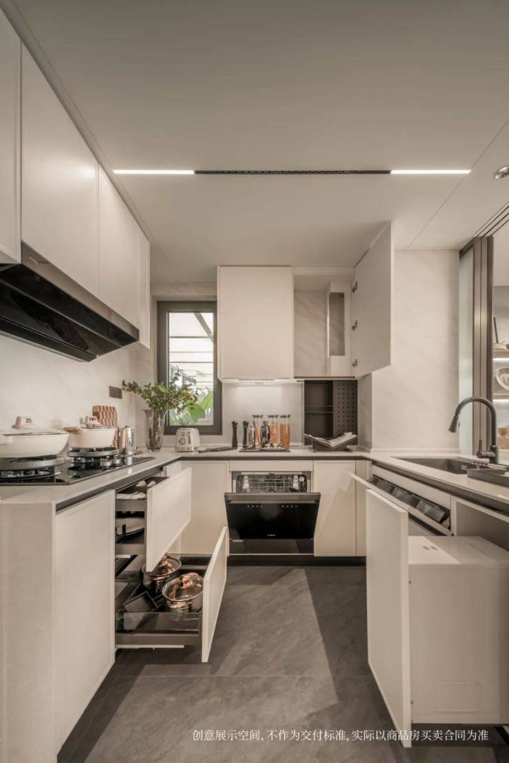 厨房U型操作台面,并配备了洗碗机、末端净水,甚至凉霸,不仅能解放双手,还解决了炎炎夏日厨房做饭闷热的烦恼;