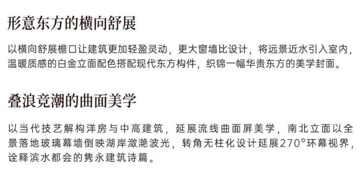 依凭半岛三面水岸的天然资源,以“一堤三面湖”和“水街襟两园”设计笔触,实现滨水互动、开门见水的场景体验;融汇吴门画派、苏州园林造园理念,营造出一座温润如玉的流动庭园。
