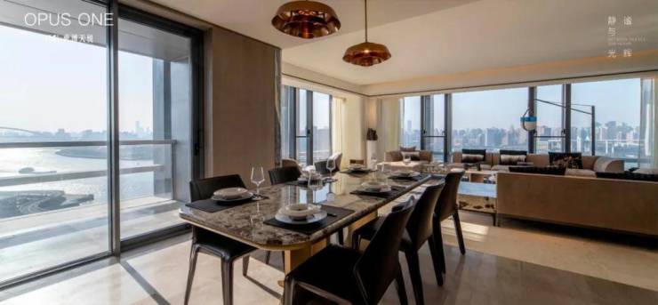 这客厅既是270°全景舱厅,无论全家在餐桌前欢聚一堂,还是孩子们在客厅嬉戏,一抬头便是以江景和城市为主题的巨幅油画。