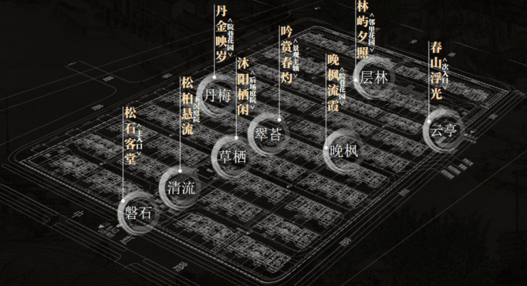 8大景观节点:营造可行、可观、可游、可居的东方诗意天地。①松石客堂-主入口;②松桕悬流-下沉庭院;③沐阳栖闲-后场庭院;④吟赏春灼-景观主轴;⑤丹金映岁-院巷花园;⑥晚枫流霞-院巷花园;⑦林屿夕照-邻里花园;⑧春山浮光-次入口