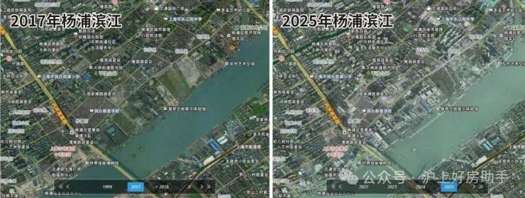 作为黄浦江畔的压轴板块,杨浦滨江的建设速度是有目共睹的,下图是2017-2025-2026年杨浦滨江的卫星影像变化图,几乎是一年一个样!