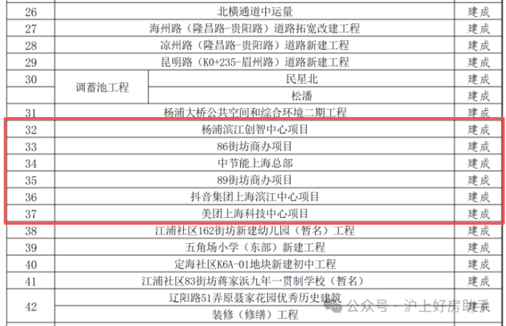 这份来自杨浦区官方公示的项目清单,清晰标注了从“新开工”“在建”到“建成”的全周期进度。其中,抖音、美团、B站、滨江创智中心的全面建成,将杨浦滨江的发展确定性,从蓝图实实在在落地为实景。