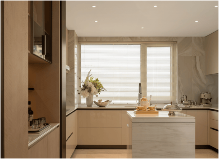 厨电奢配:叠墅标配德国Miele三件套(燃气灶、抽油烟机、洗碗机),联排升级为五件套(增微烤一体机 + 嵌入式冰箱);