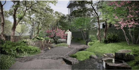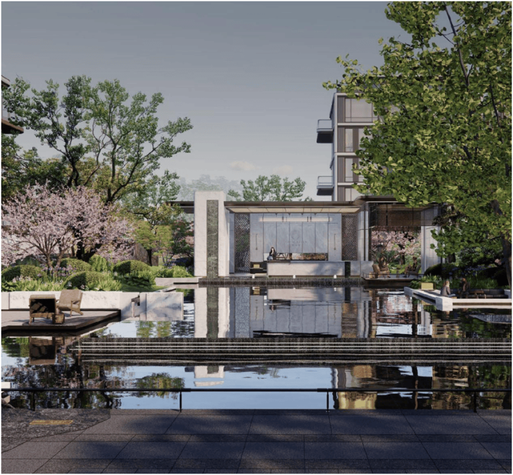 【怀山望】景观设计由绿城高端御用设计师宋淑华大师执笔,以仇英《桃花源图》为蓝本,匠心打造九曲流溪园林,借鉴苏州留园“三收三放”的造园精髓,铺陈开八重水境的盛景,让居者不出社区,就能沉浸式拥抱桃源的自然诗意。