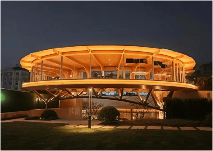 搭配作为会所标志性景观的360°钢木结构悬浮廊桥,打破传统景观平面化局限,造型轻盈灵动,将会所与社区园林、墅居建筑群自然串联,既实现360°无死角观景,又成为业主休憩、社交的专属空间。