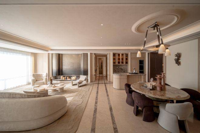 约3.45米的层高更是一大杀手锏——当大多数顶豪停留在3.1-3.2米时,多出的这25-35cm,就是豪宅“呼吸感”的来源。即使安装中央空调和地暖后,依然能保持充裕的室内净高。