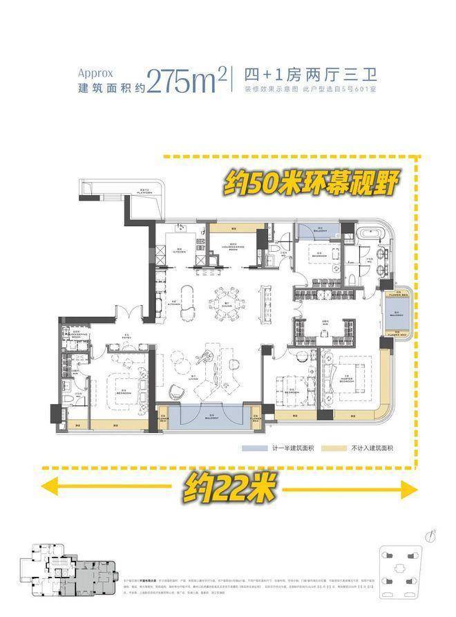 275㎡户型全屋约50米环幕视野,南向约22米采光!