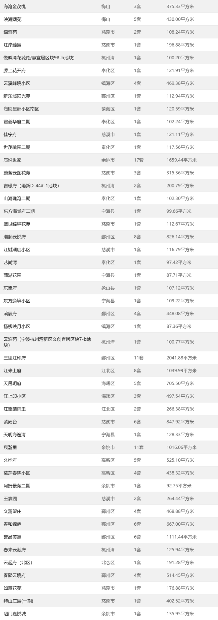 鄞州区成交44套,销售面积6190.81平方米,位居排名前列;余姚市成交30套,销售面积2904.2平方米,位居第二。慈溪市成交19套,销售面积2662.81平方米,位居第三;