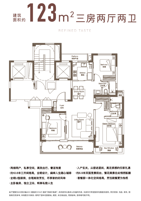建面约123㎡户型,三开间朝南,约6.9米双面宽景阳台,主卧套房设计,匹配独立卫浴。