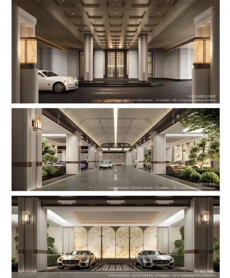 入口约99米超尺度宏阔气象,取海派艺术大师吴湖帆《晓云碧嶂》中云岫初开的晨曦图,通过渐变晕染的山水长卷演绎青峰山林的诗意场景。奢石、名树点染其中,勾勒尊崇归家序幕。
