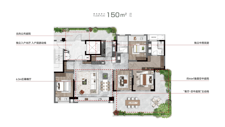 建筑面积约150㎡起,皆一梯一户大平层+约30-50㎡墅级空中庭院,比平层别墅化,比别墅人性化。