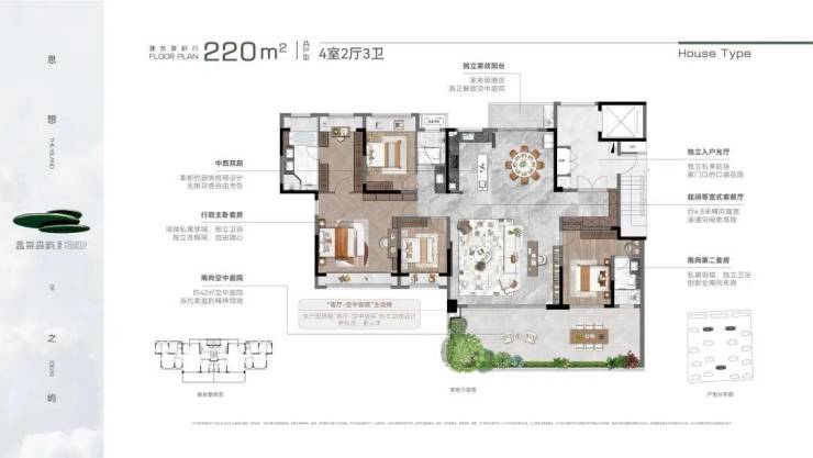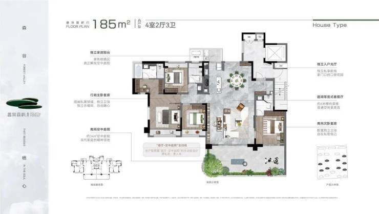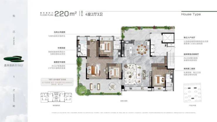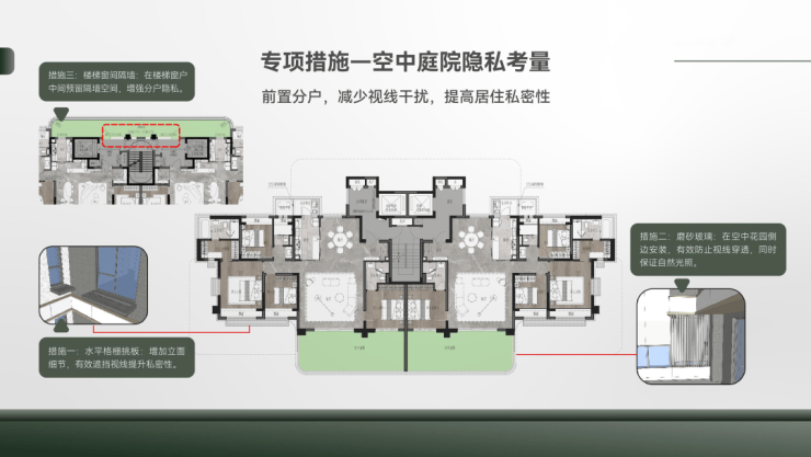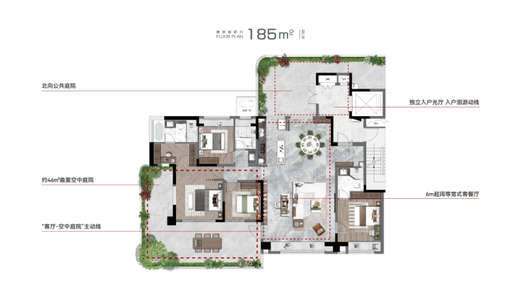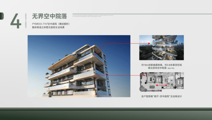 创新曲面转角院落,并实现全户型搭载“客厅-空中庭院”的主动线设计,整体营造立体墅式庭院生活场景。