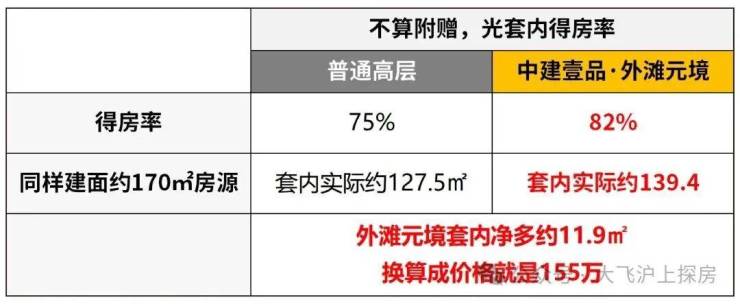 正常的新房,其套内的得房率最高也就是75%。而中建壹品·外滩元境的得房率足足有约82%。