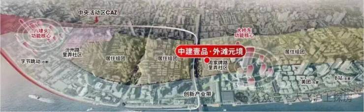 在杨浦滨江版九宫格中,主要是高端住宅+1块风貌商办,而紧邻九宫格的四至方位可以看到: