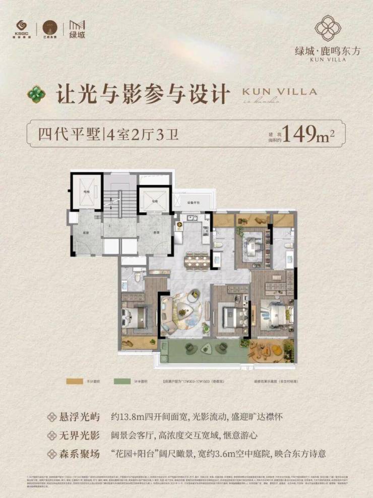 建面约149㎡四室两厅三卫:折后单价约 2-2.1 万 /㎡,总价 280-380 万;约 14m 大面宽、7.25m 宽厅、空中庭院、高窗墙比、南北通透
