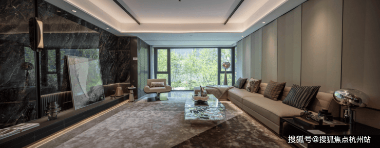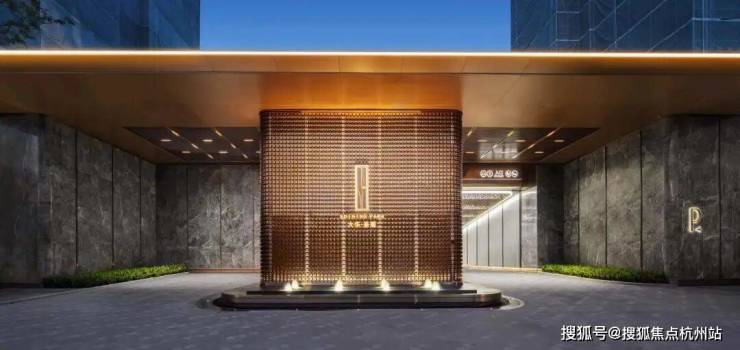 3、高端的爱马仕灰奢石打造的景墙,转角弧面犹如犹如翡翠赌石,优雅贵气。