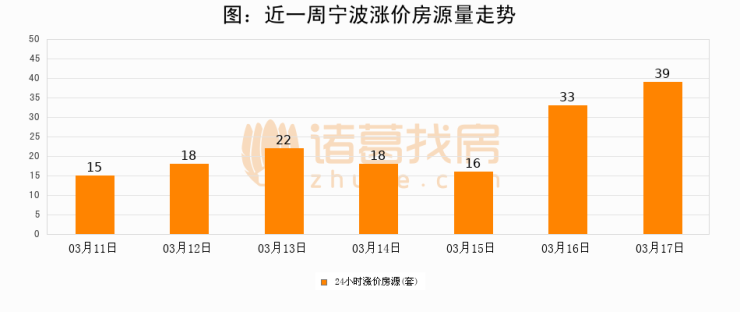 根据诸葛找房数据显示,宁波24小时涨价房源量为39套,较03月16日增加6套,环比上涨18.2%。与此同时,涨价房源占比小幅扩大,业主信心有所提升。