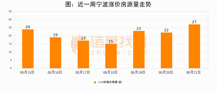 根据诸葛找房数据显示,宁波24小时涨价房源量为27套,较08月20日增加5套,环比上涨22.7%。与此同时,涨价房源占比小幅扩大,业主信心有所提升。