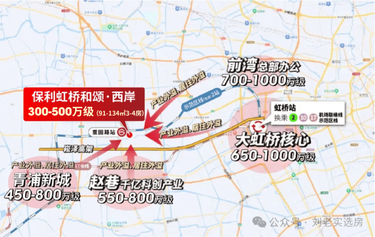 从周边区域房价来看,东面2站之隔的前湾,房价已达700-1000万级;徐泾650-1000万级,赵巷550-800万级,即便下游的青浦新城,房价也处于450-800万级
