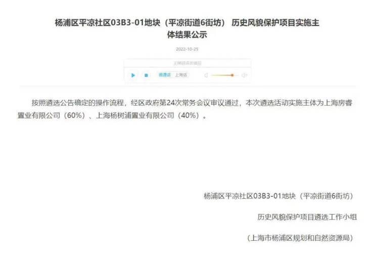 2022年10月25日,杨浦区人民政府官网发布公告,杨浦区平凉社区03B3-01地块(平凉街道6街坊)历史风貌保护项目实施主体结果公示:“本次遴选活动实施主体为上海房睿职业有限公司(60%)、上海杨树浦置业有限公司(40%)。”